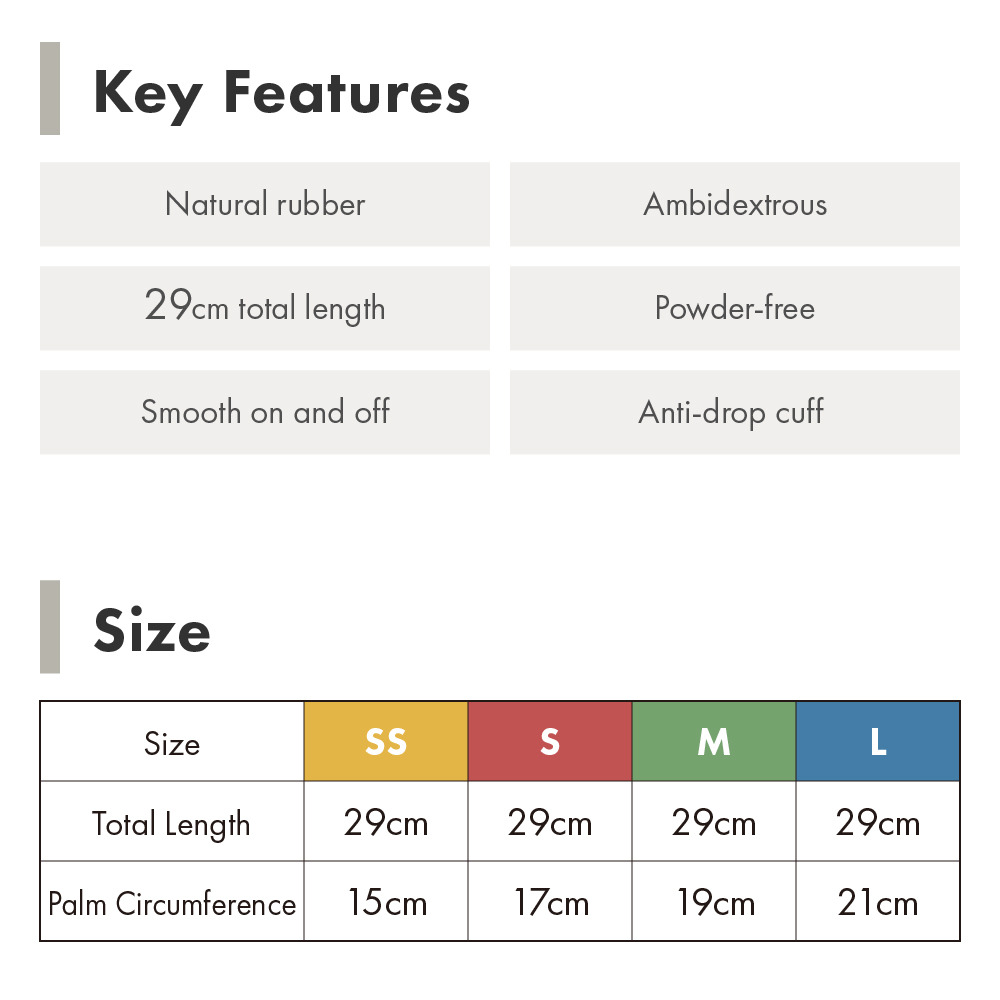 Made from high-quality natural rubber, the glove fits comfortably to your fingers for a secure feel. The chlorinated surface allows for easy on and off, even when hands are wet. Powder-free to help minimize allergy concerns and support a comfortable working environment.
