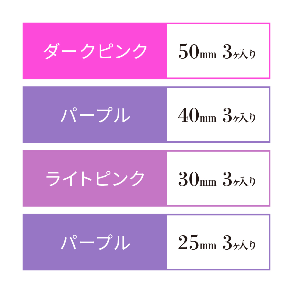 サイズ | 全長:105mm ダークピンク:50mm パープル:40mm ライトピンク:30mm パープル:25mm |