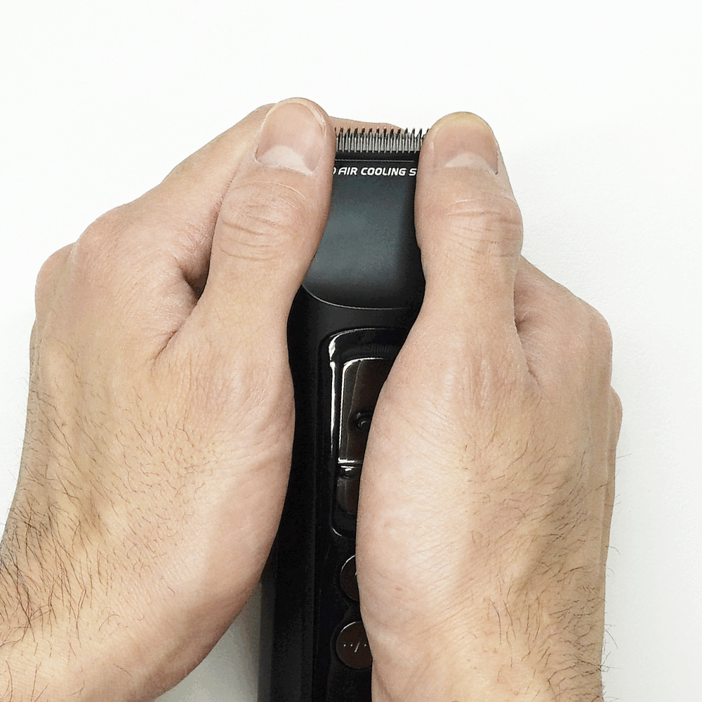 刃の飛び出しを防ぐため、 必ず両手で抑えながら取外しを。内部の毛クズをスムーズに除去でき、マシンのベストコンディションを安全・確実に維持。