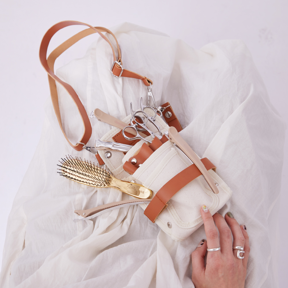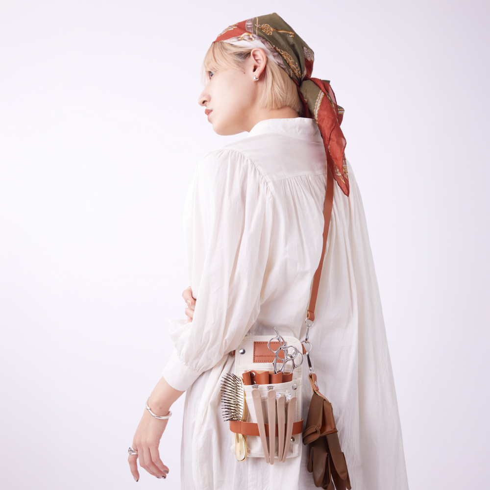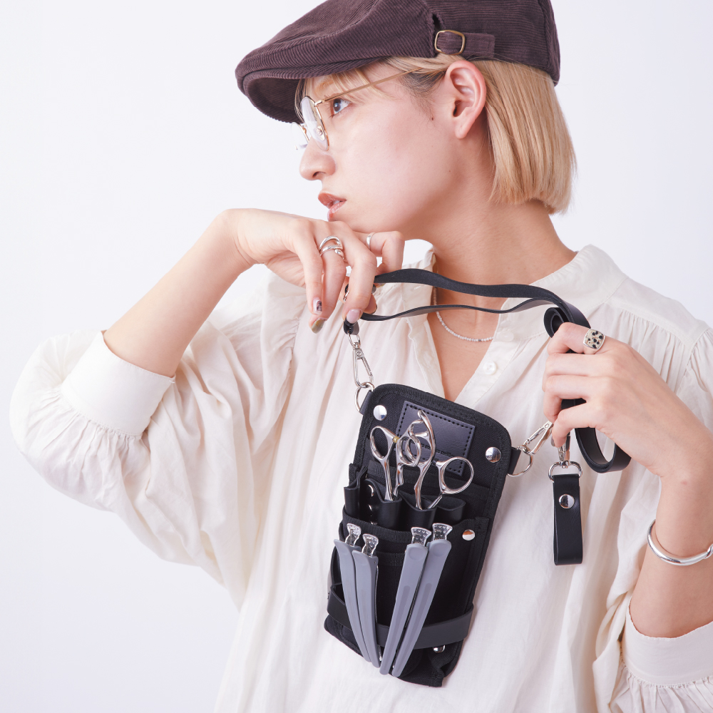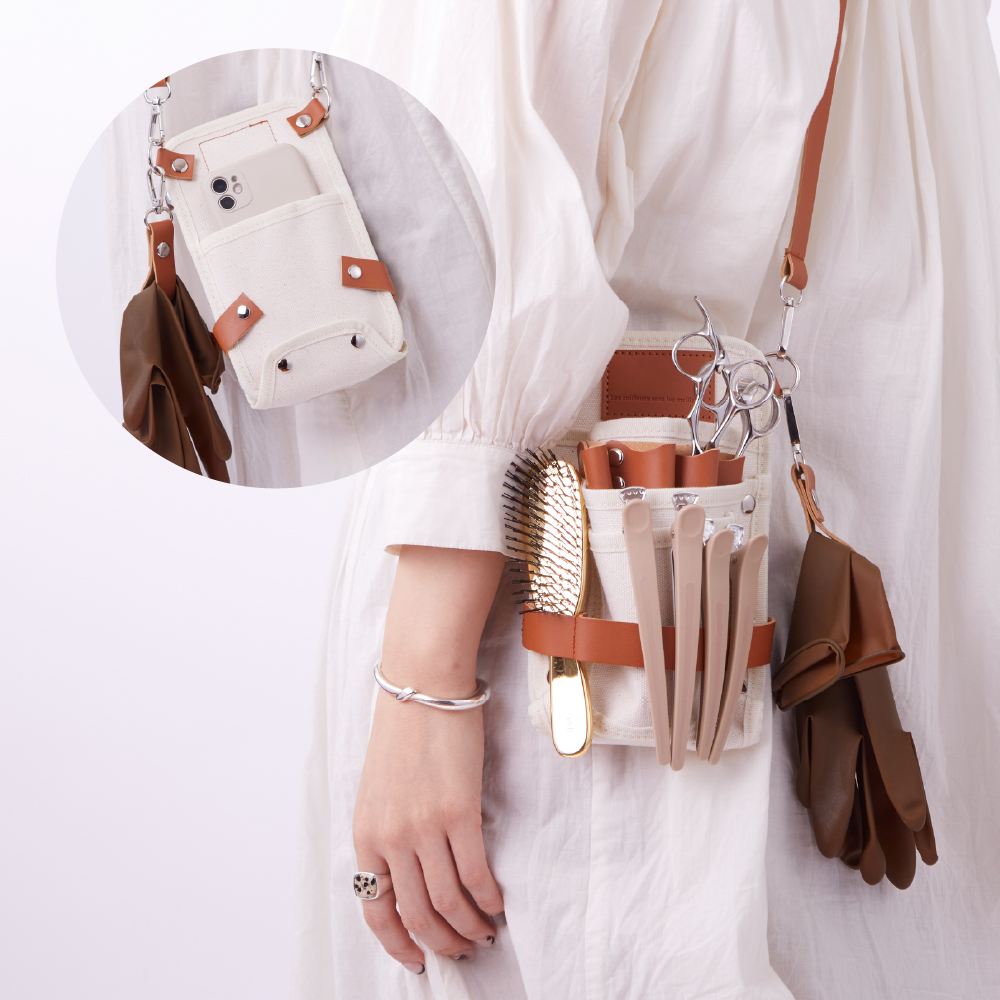 シザー4丁はもちろん、スマホ、メモ帳、ブラシにグローブ。コンパクトな見た目以上に、サロンワークの必需品がしっかり収ま る。バッグを持たずに、身軽にフロアを動き回れる収納力。