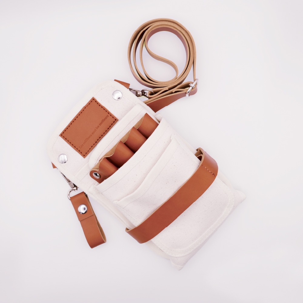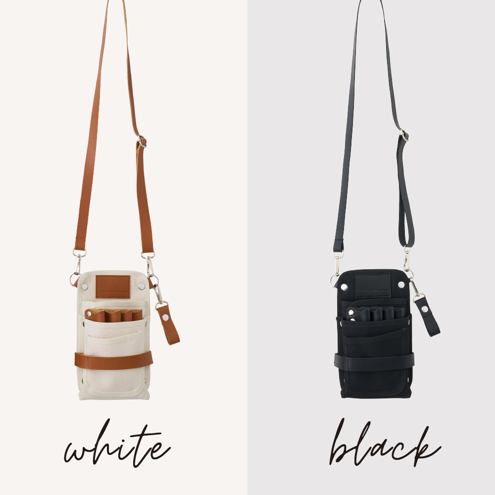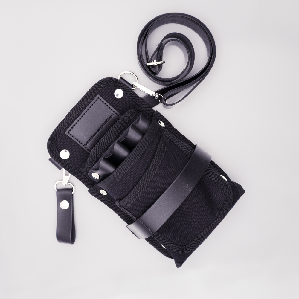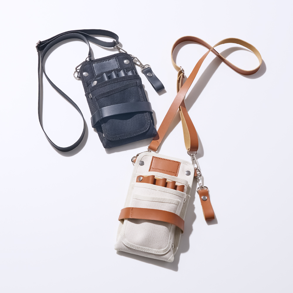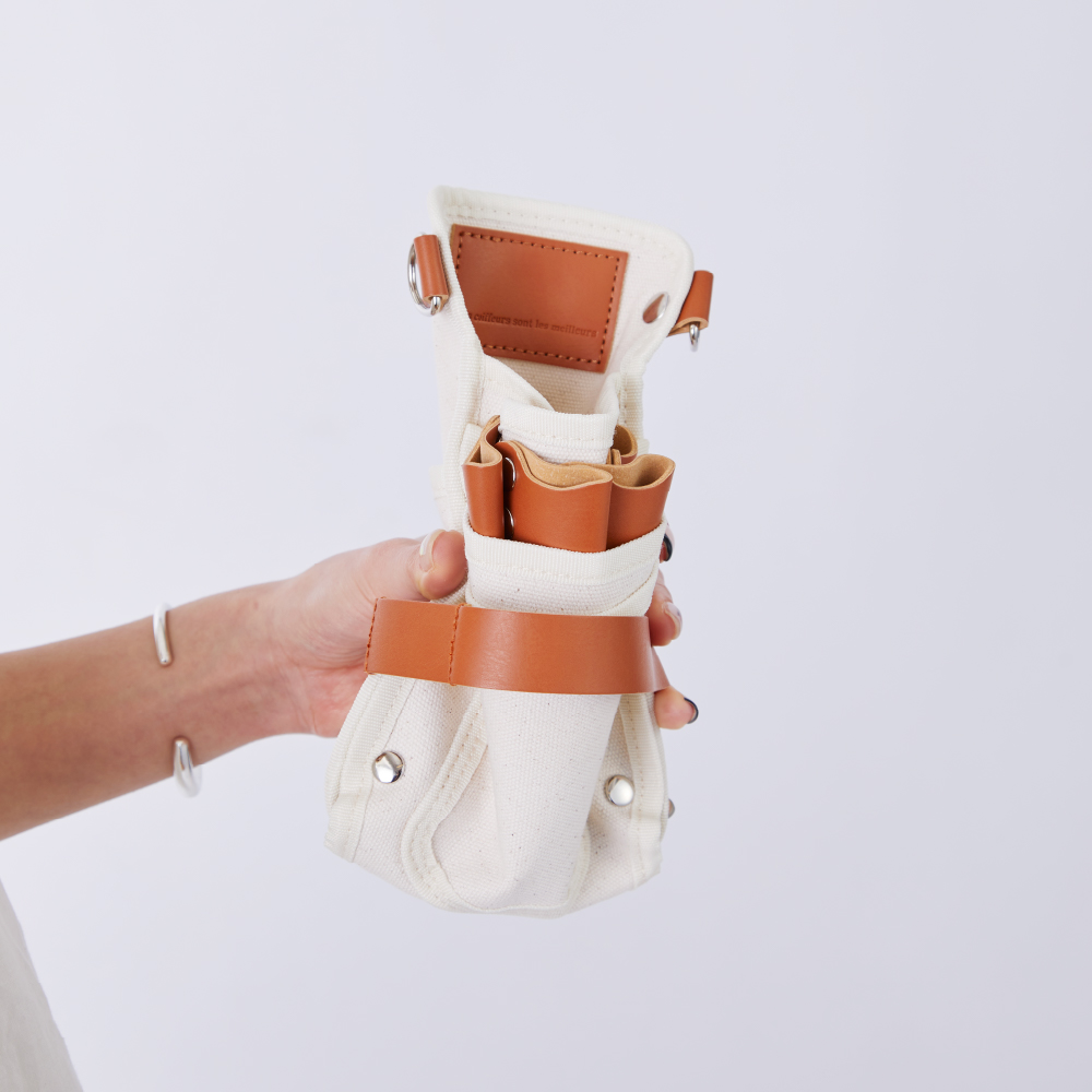 シザー4丁はもちろん、スマホ、メモ帳、ブラシにグローブ。コンパクトな見た目以上に、サロンワークの必需品がしっかり収ま る。バッグを持たずに、身軽にフロアを動き回れる収納力。
