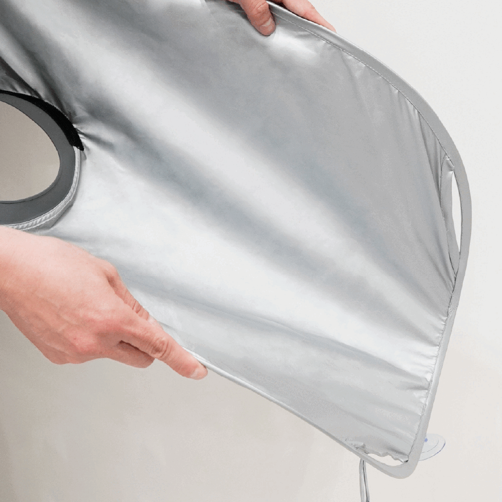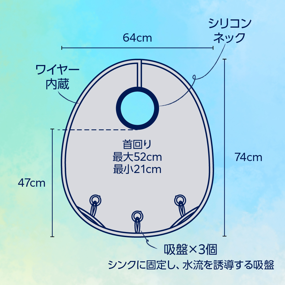ケープのフチに内蔵されたワイヤー構造が、様々な姿勢にフィットし水をガード。 さらに、付属の吸盤でシンクにしっかり固定することで、シャンプー台のようなスムーズな水路を作ります。 設備工事は一切不要。今ある洗面台が、一瞬で「プロの洗い場」に変わります。